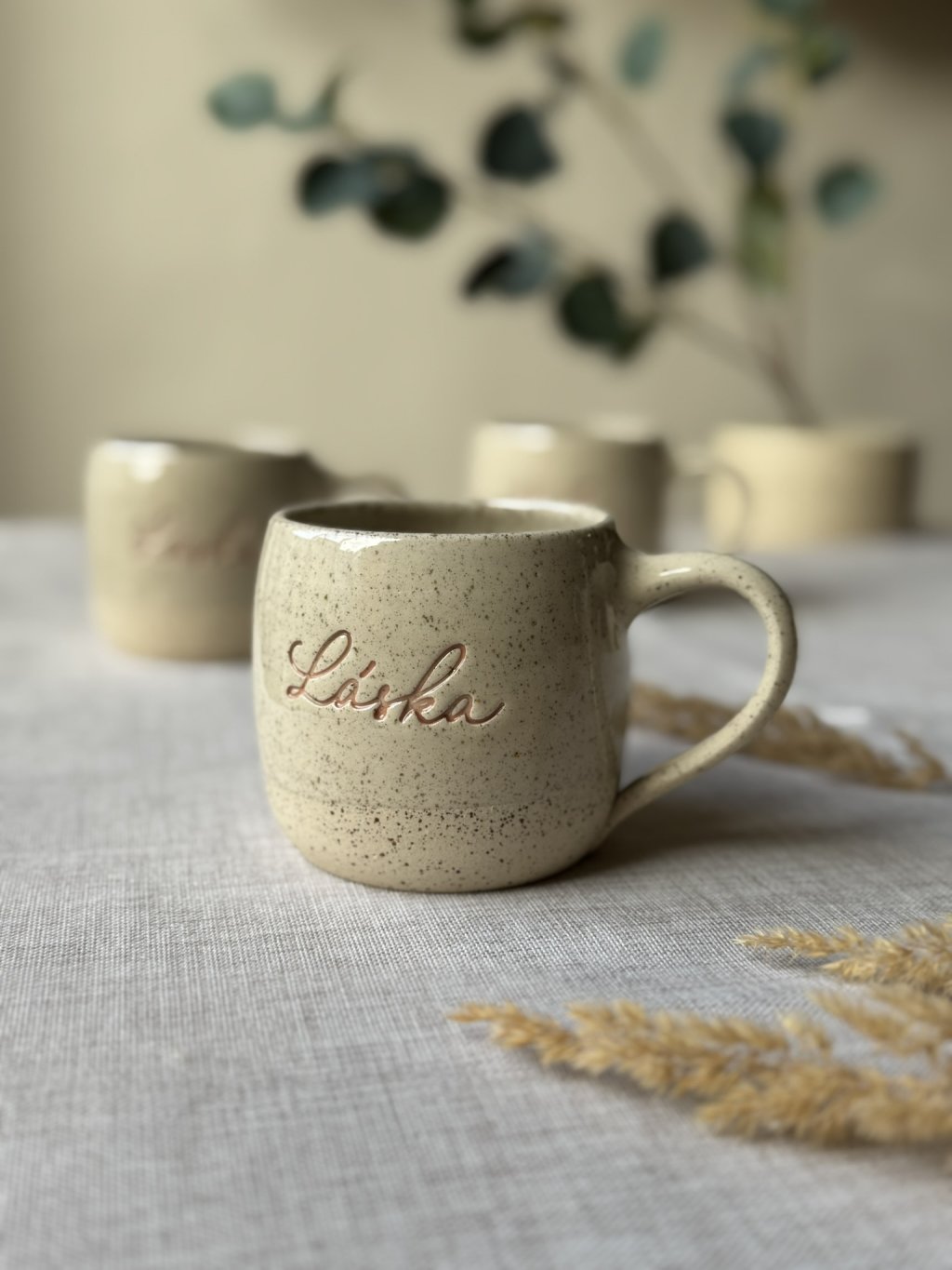Na kruhu točený kameninový hrnek z kropenaté hlíny. Následně ručně zdoben nápisem Láska.