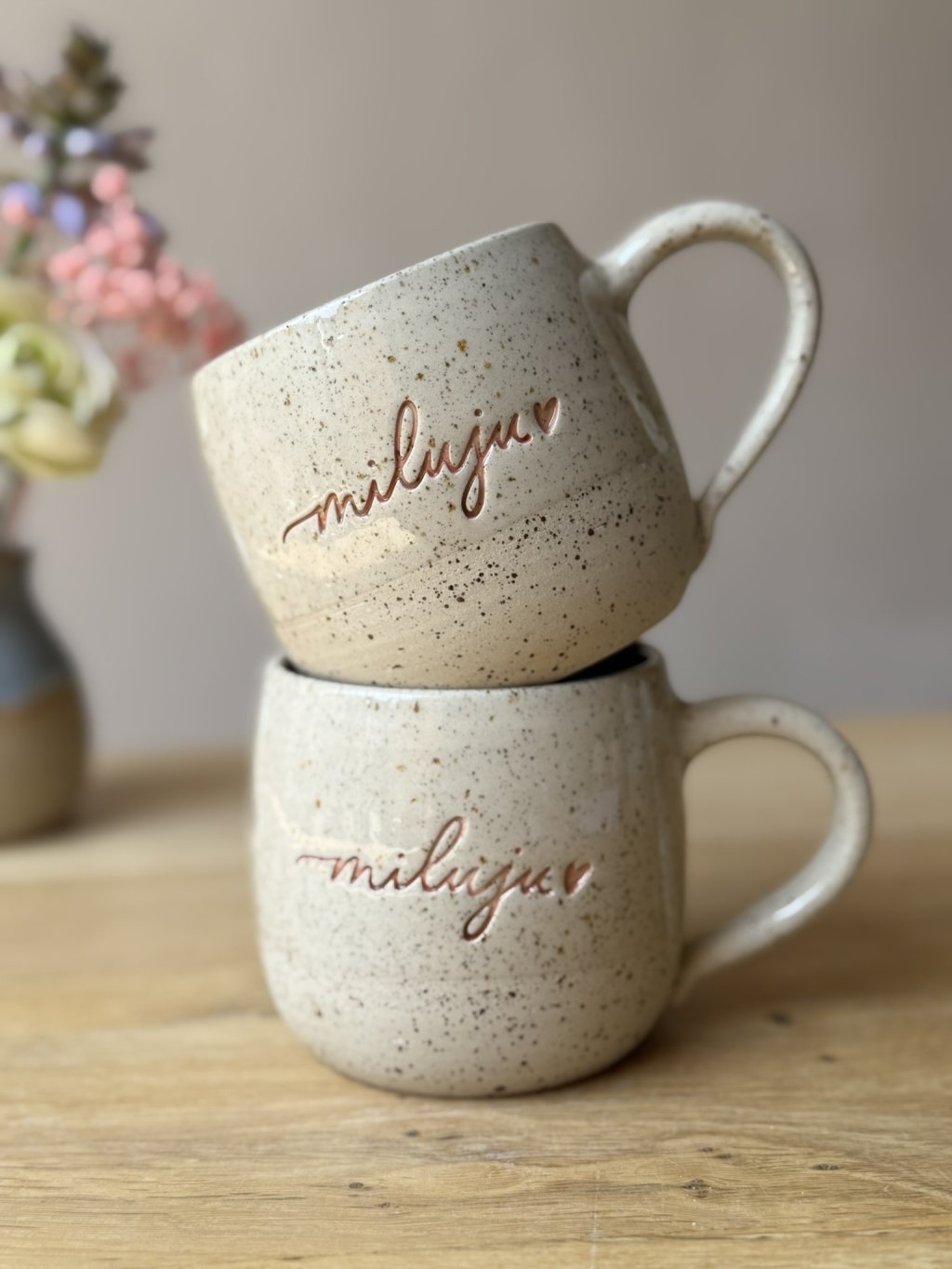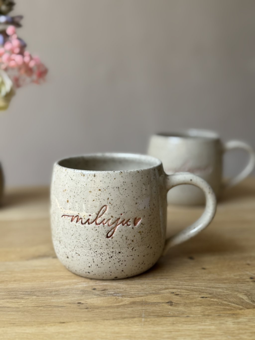 Na kruhu točený kameninový hrnek zdobený nápisem miluju.