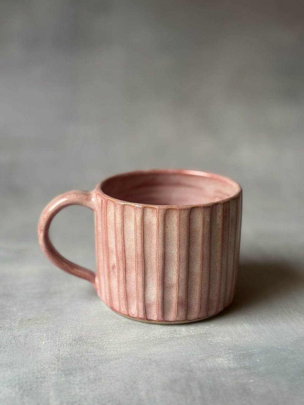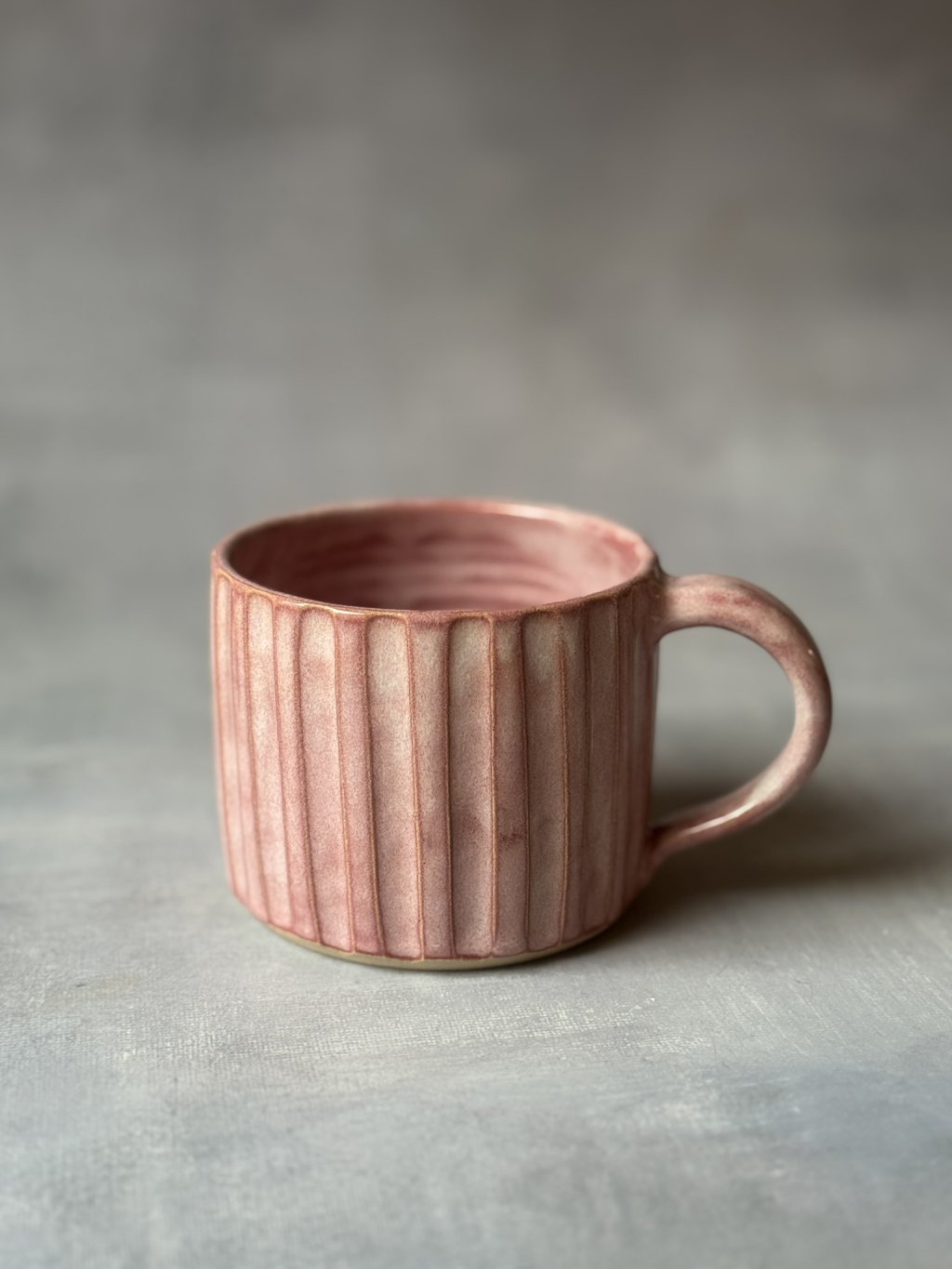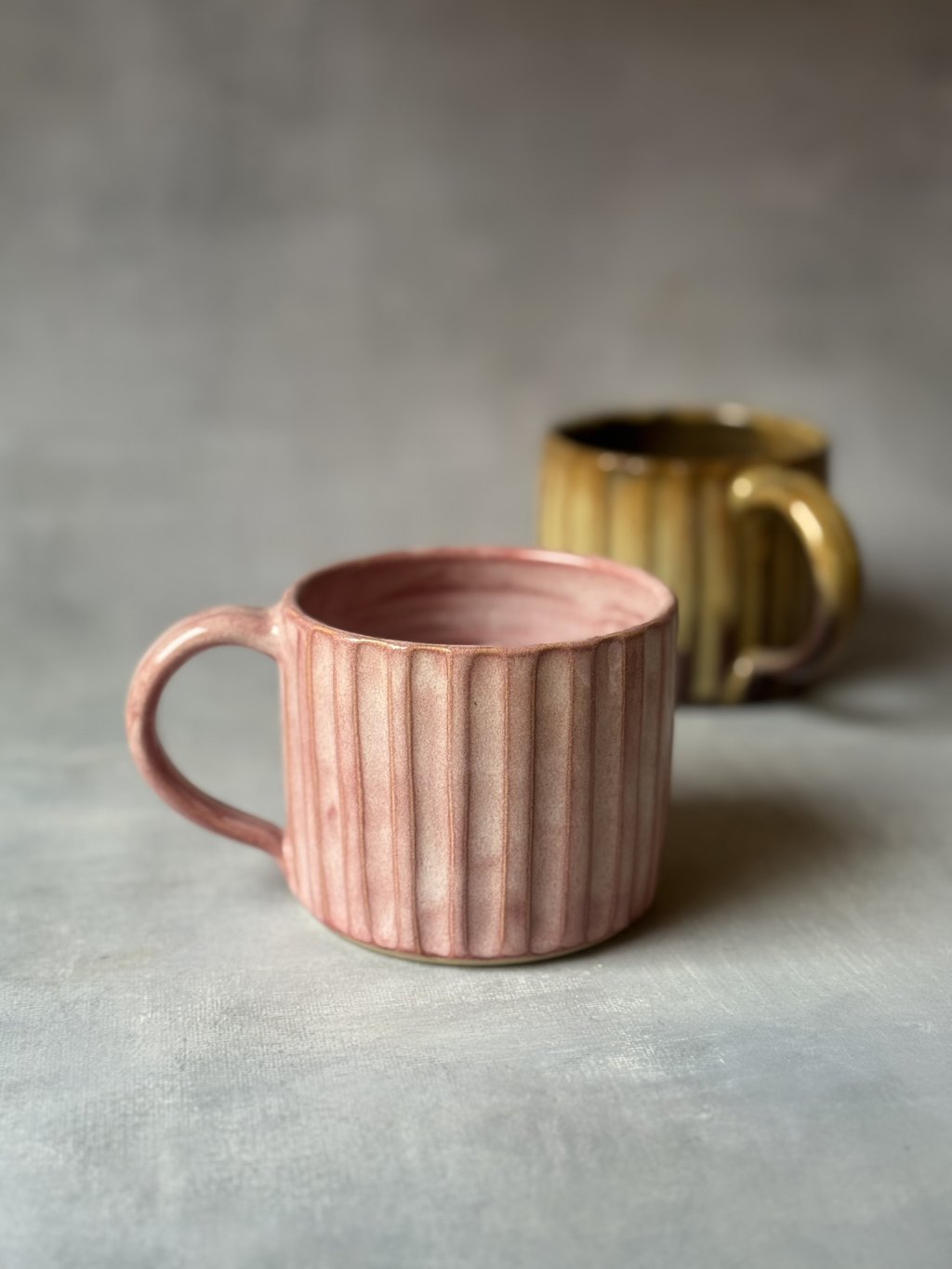 Na kruhu točený kameninový hrnek ze světlé hlíny.