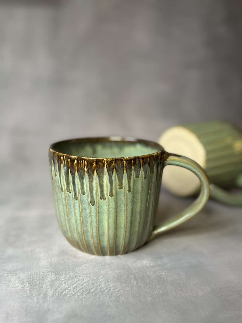 Na kruhu točený kameninový hrnek ze světlé hlíny.