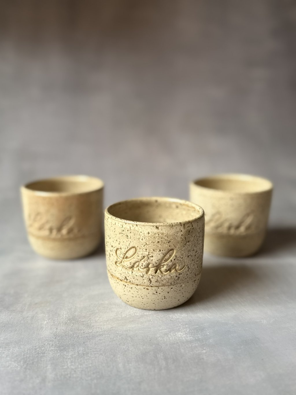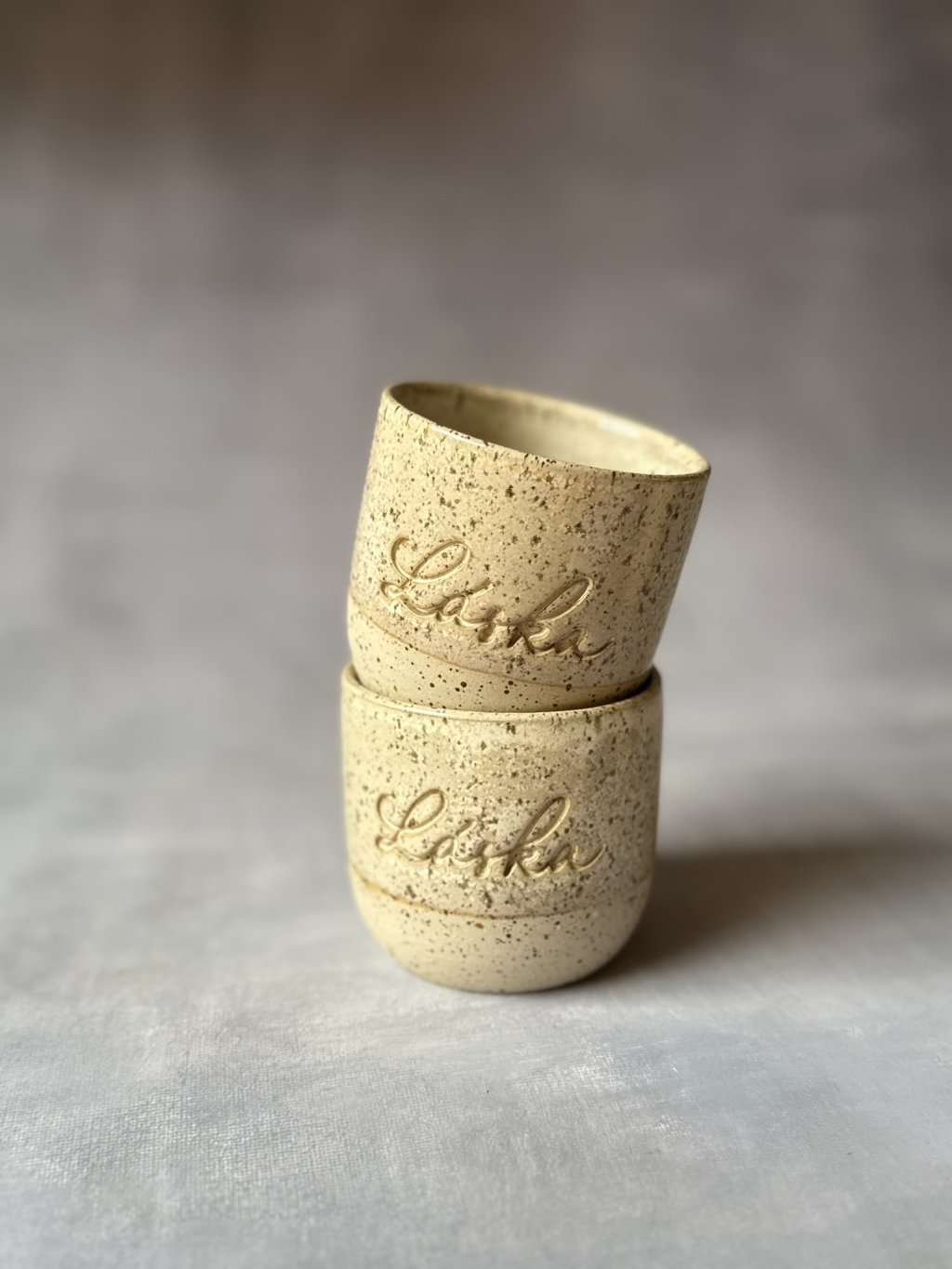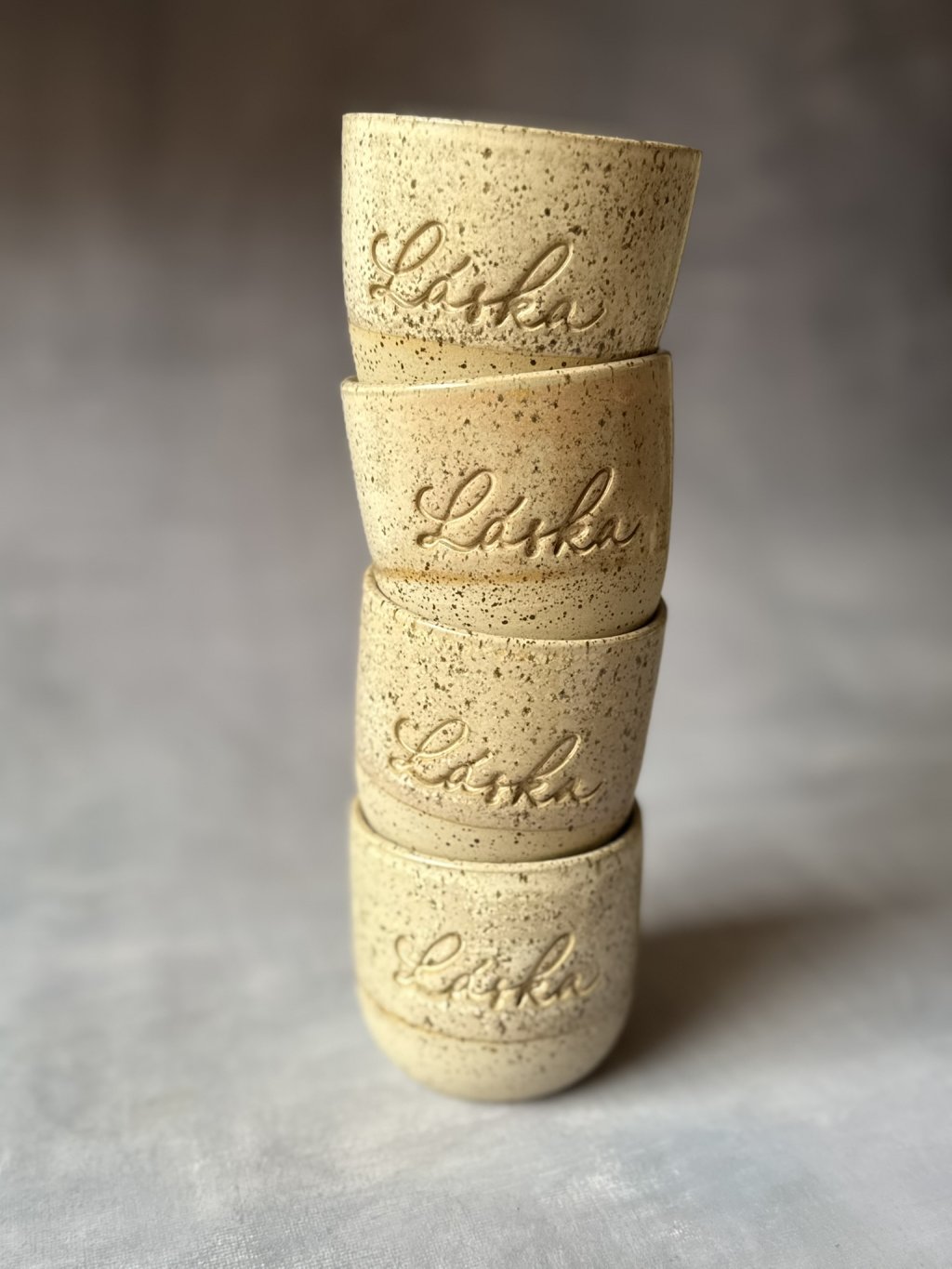 Na kruhu točený kameninový kalíšek z kropenaté hlíny. Zdobený nápisem Láska.