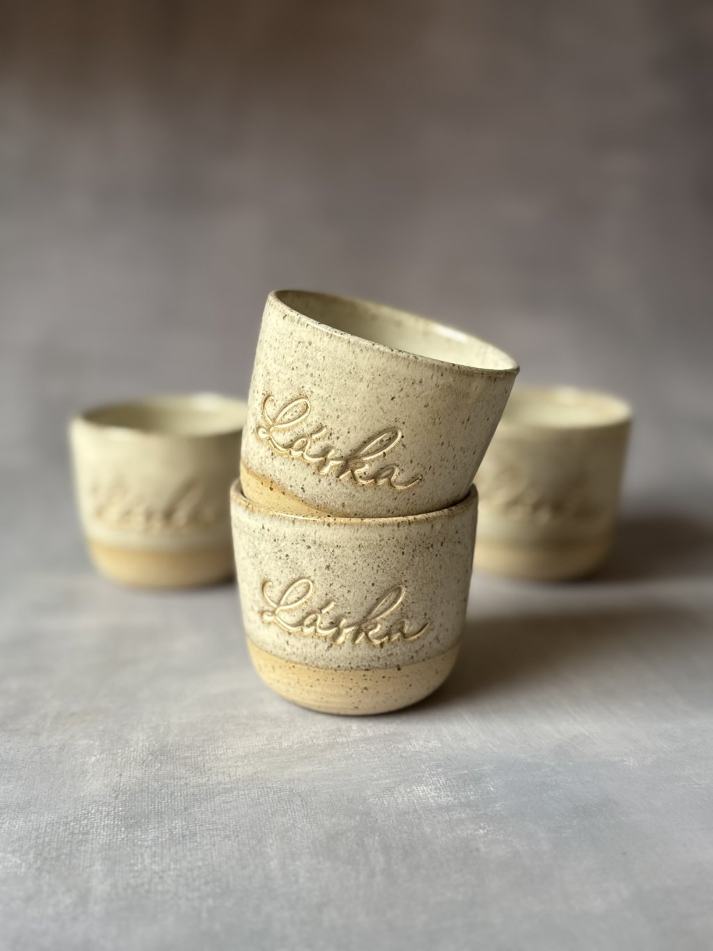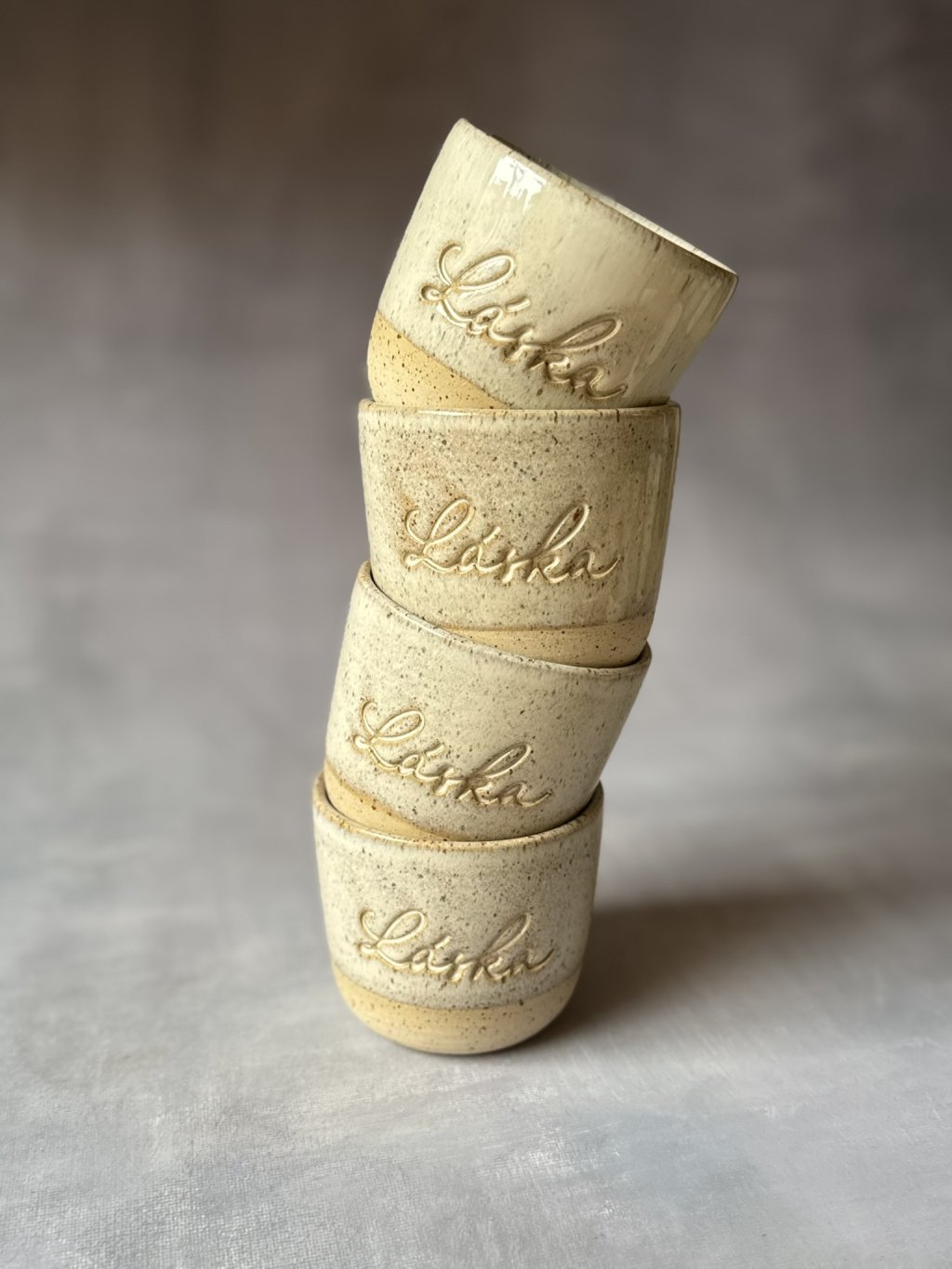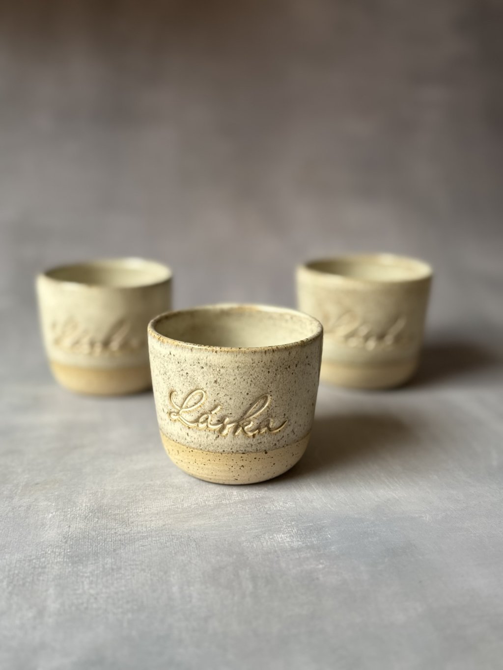 Na kruhu točený kameninový kalíšek z jemně kropenaté hlíny. Zdobený nápisem Láska.