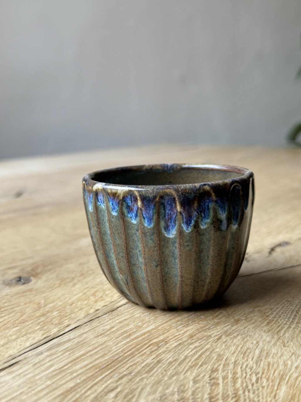 Na kruhu točený kameninový kalíšek ze světlé hlíny. Glazovaný efektní glazurou.