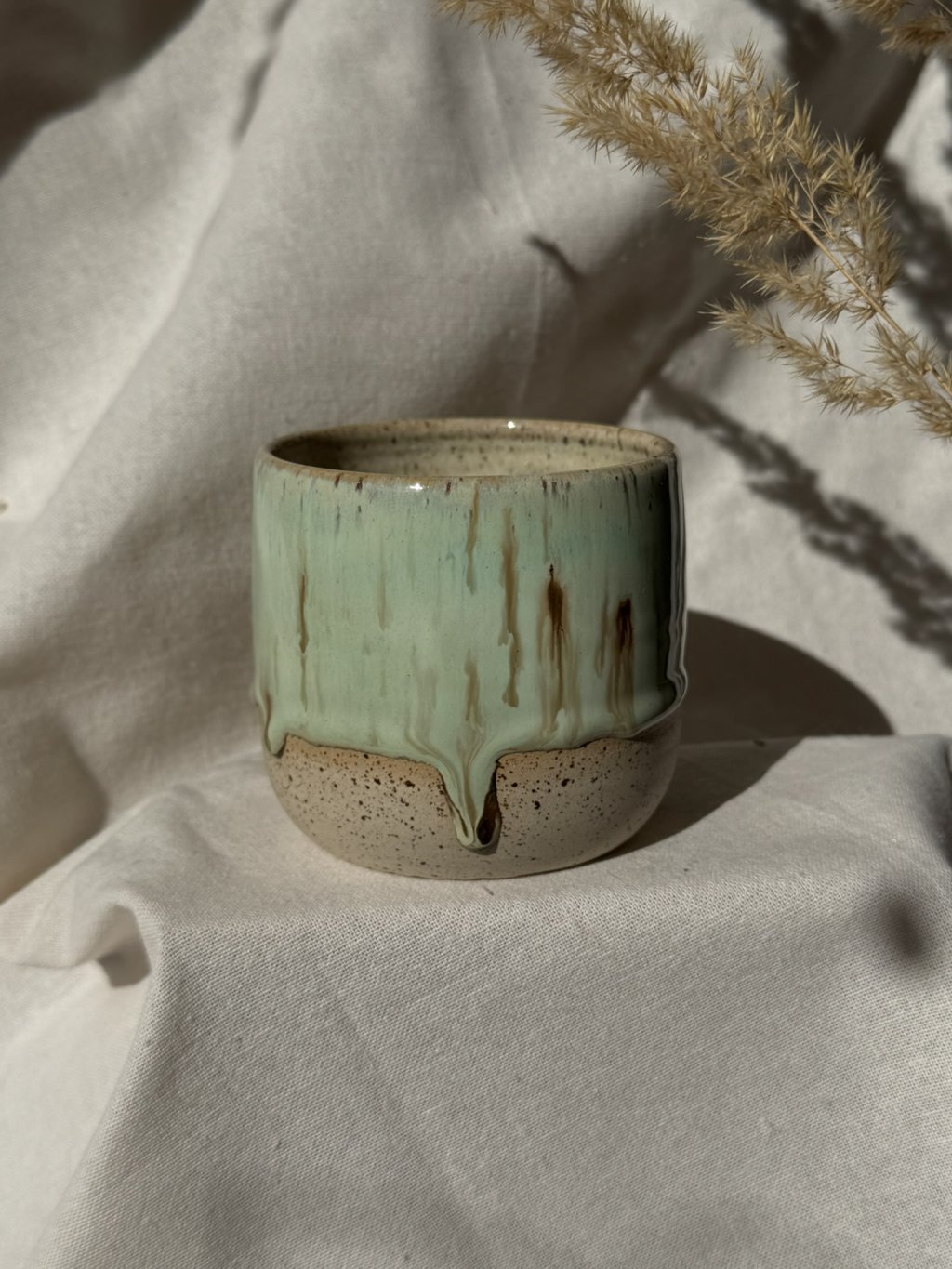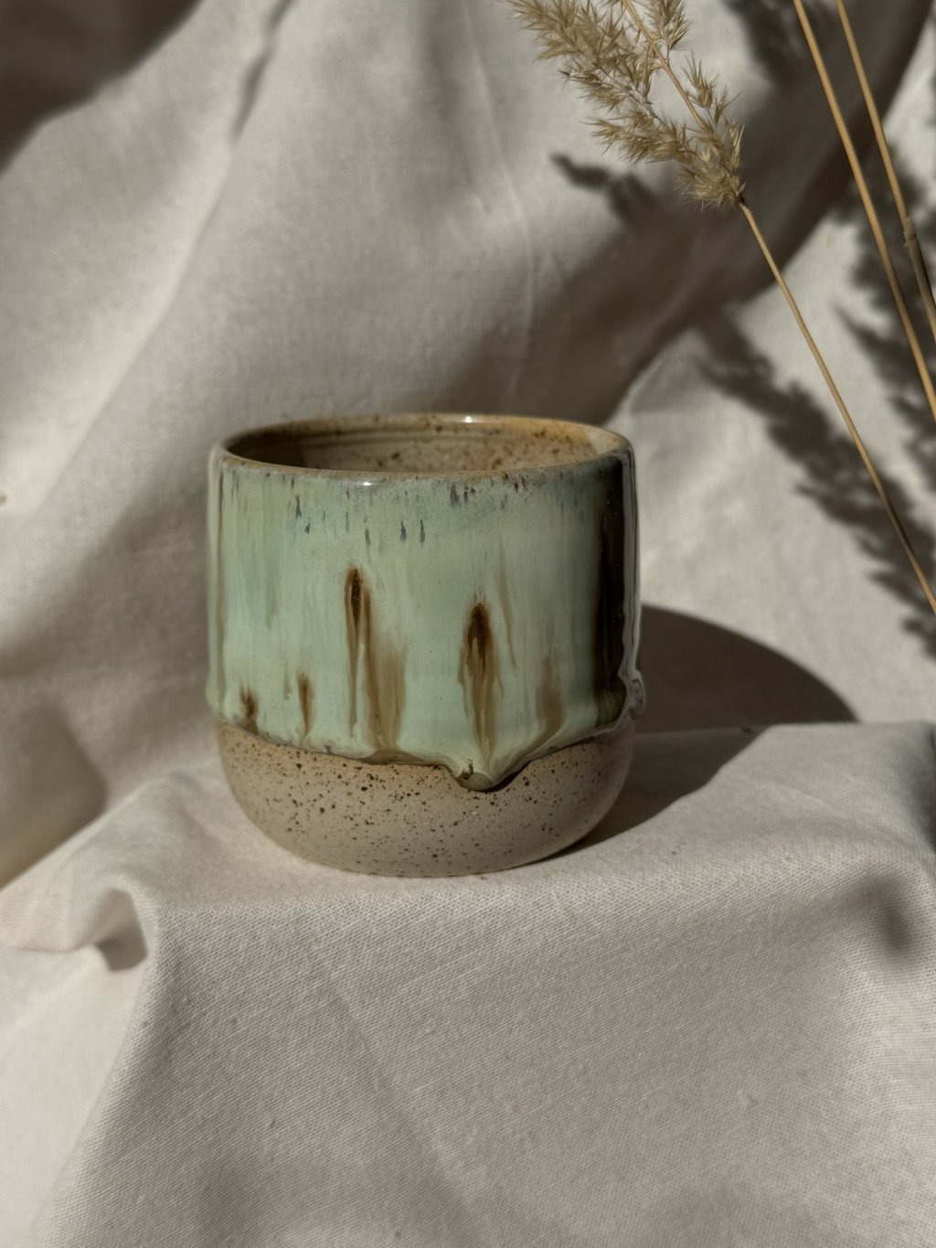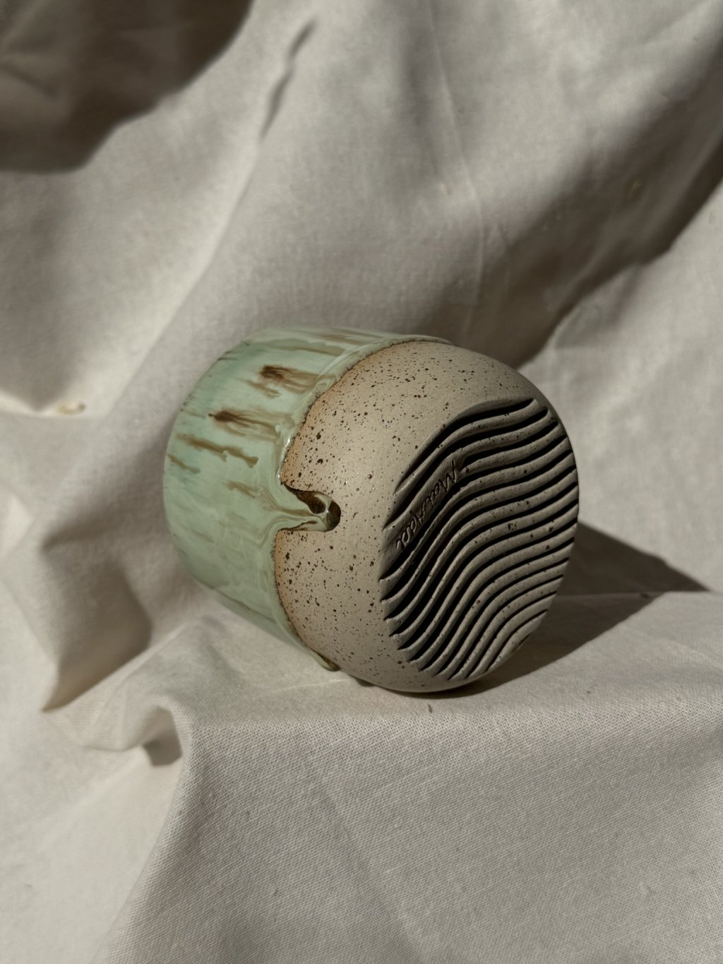 Na kruhu točený kameninový kalíšek ze světlé hlíny.